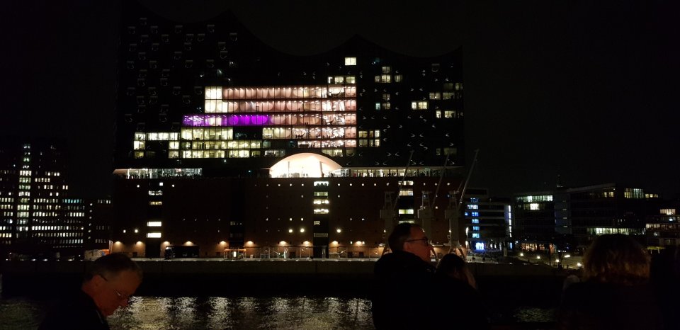 Hier die Elbphilharmonie bei Nacht vom fahrenden Schiff aus