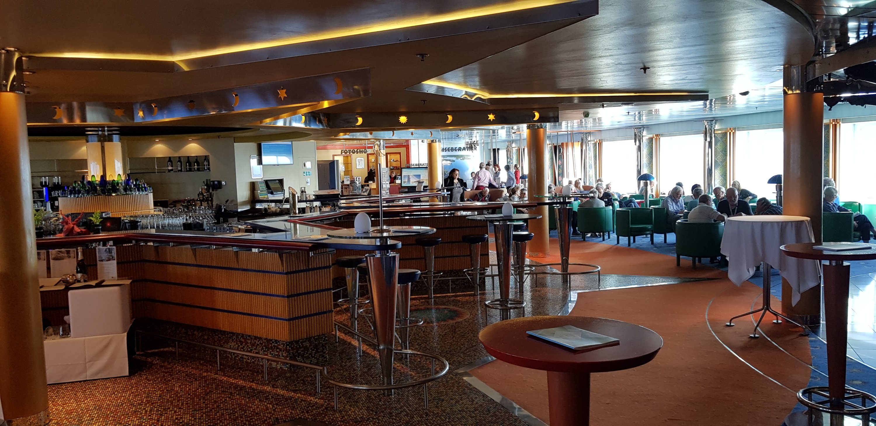 Hier sieht man die Aida Bar. Im Hintergrund rechts sitzen Gäste und genießen die Aussicht. Verzehr in den Bars sind keine Voraussetzung, um sich hier aufzuhalten. Es gibt noch eine Reihe anderer Bars, z.B. die Anytime Bar, ganz ganz oben über Deck 10. Diese Bar ist für die nachtaktiven Gäste rund um die Uhr, 24 Stunden lang geöffnet.