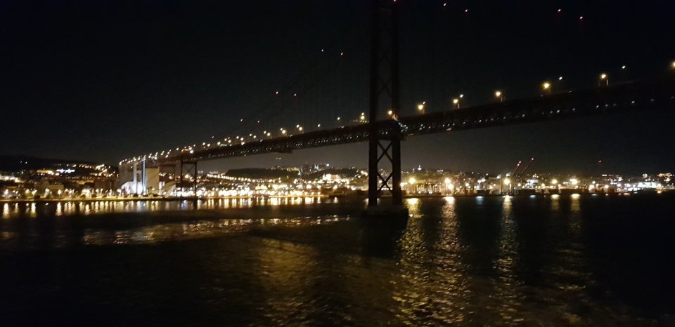 Absolutes Highlight ist die 3,2 Kilometer lange Brücke des „25. April“ (Nelkenrevolution) , die beim Unterqueren durch den auf ihr fließenden Verkehr (auf einer gelochten Fahrbahn) ein interessantes Geräusch erzeugt. Von mir in der Nacht beim Einlaufen der AIDAcara fotografiert.