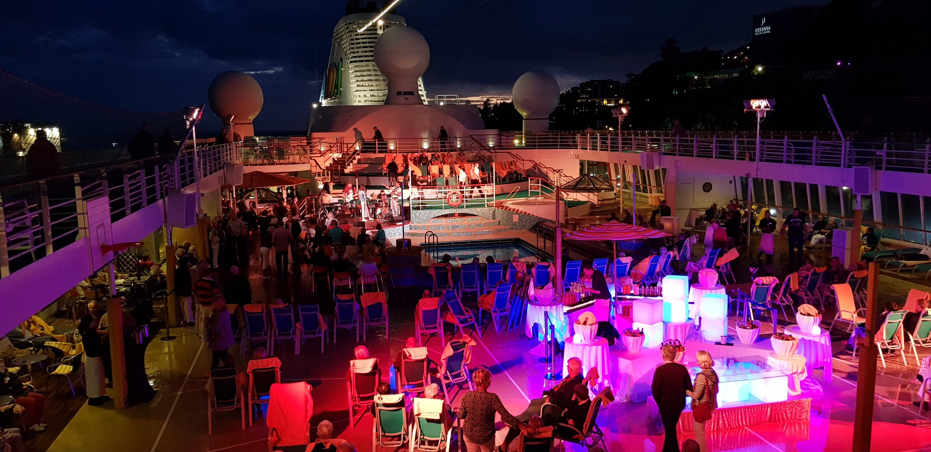 Zum Abschluss noch ein Blick auf das Freideck, auch Sonnendeck genannt. Die gelb Gewandeten sind keine Ansammlung von Hare Krishna Anhängern, sondern lediglich in warme, gelbe Decken gekuschelte AIDAcara Gäste. Und abends b.z.w. nachts sieht es dann so aus: