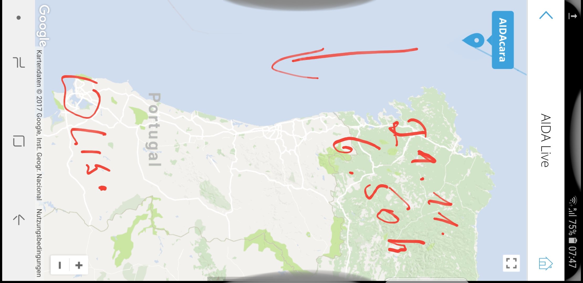Heute Abgabe der Reisepässe für alle Gäste. Für die Vorbereitung der kommenden, nicht-europäischen Häfen auf unserer Weltreise benötigt die Rezeption von jedem Gast den Reisepass. Ansage vom Kapitän von Deck 10: „Wir erreichen Lissabon bereits heute Nacht gegen ca. 0 Uhr“.