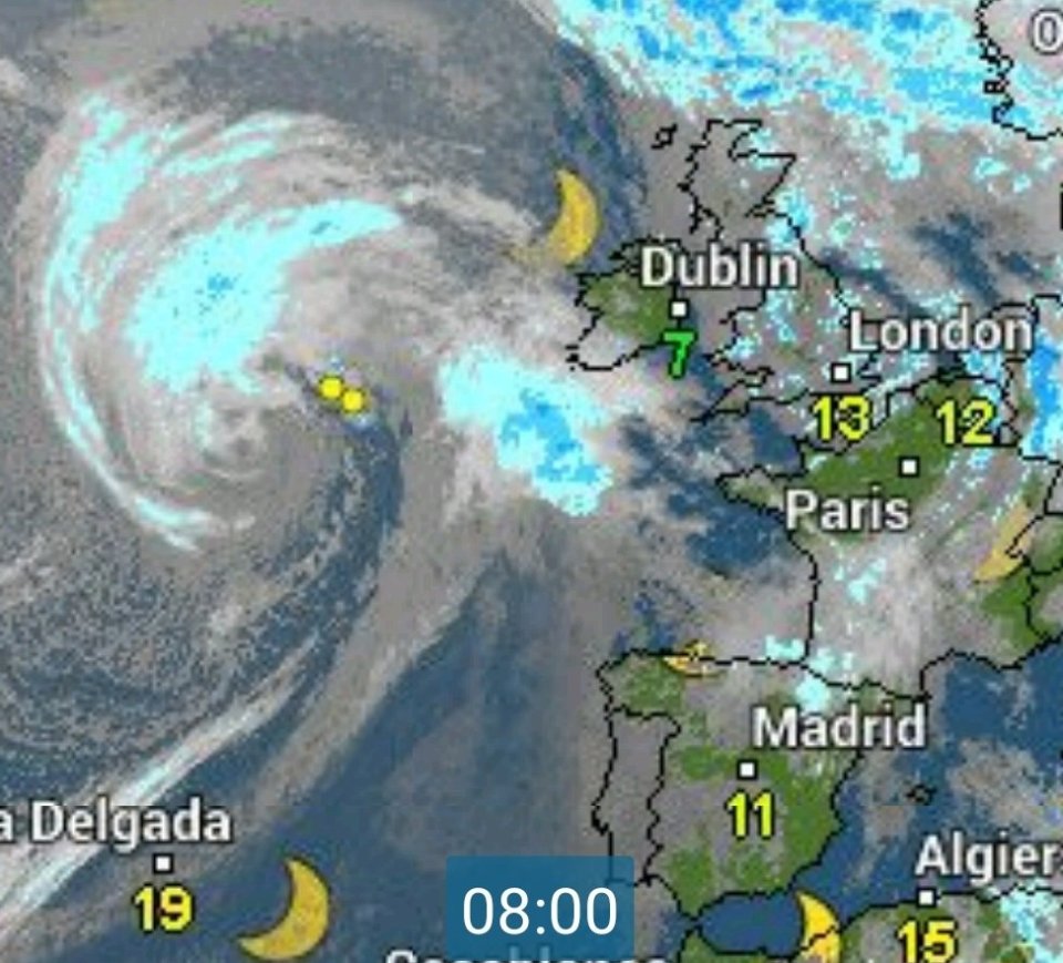 Ich bin kein Metrologe, aber das müssen die Auswirkungen dieses riesigen Wirbels sein, den wir auf dem Bild erkennen können. Dieses Tief hat ein Durchmesser von rd. 500 Kilometern.