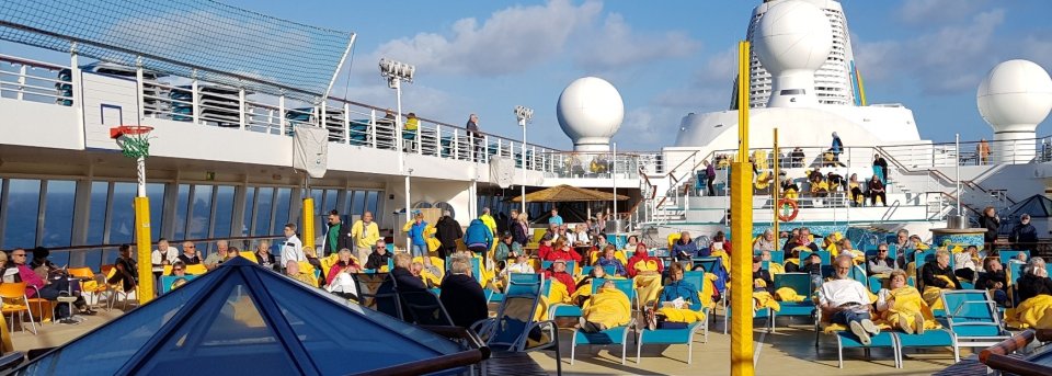 Die Temperaturen draußen liegen z.Zt. zwischen. 16 bis 18 Grad, Tendenz steigend, man darf nur nie den Fahrtwind vergessen, Stichwort Hautabrisskälte. Wenn hier alle Liegestühle entfernt sind, spielt man Basket-, Faust-, Volleyball etc..