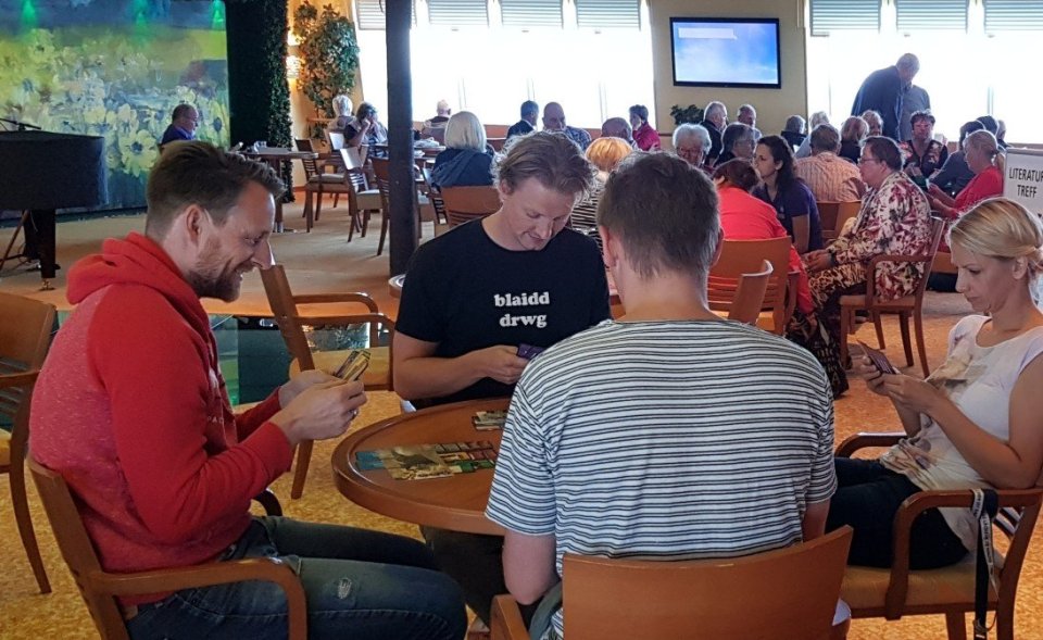 Jok des Tages: Der Hafenpastor gibt jedem Konfirmanden eine Tasche voll mit Bibeln, die sie in der Neubausiedlung verkaufen sollen. Da kommt auch ein sprachbehinderter Junge hinzu, und sagt: „I-i-ch w-will auch v-v-ver-k-kauf-f-fen.“ Am Abend treffen sich alle beim Hafenpastor. Die Meisten haben nur eine oder keine Bibel verkauft, nur der Stotterer hat die ganze Tasche verkauft. „Wie hast du das gemacht?“, fragt der Hafenpastor überrascht. „G-g-ganz einfach“, antwortet der Junge. „I-i-ich ha-habe ge-ge-geklingelt und g-ge-gefragt: Wo-wol-wollen S-S-Sie eine B-B-Bi-be-bel k-k-k-kaufen o-o-o-oder s-soll ich sie I-Ihnen v-v-vor-le-lesen?“