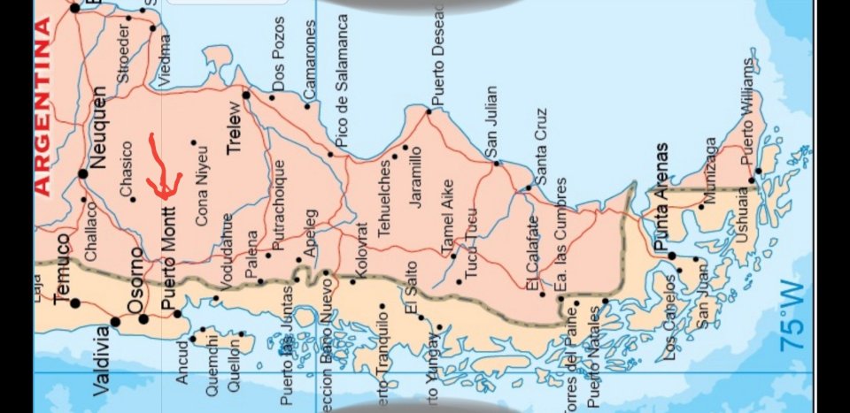 Rot markiert unser derzeitiges Reiseziel Puerto Montt, Karte quergelegt!