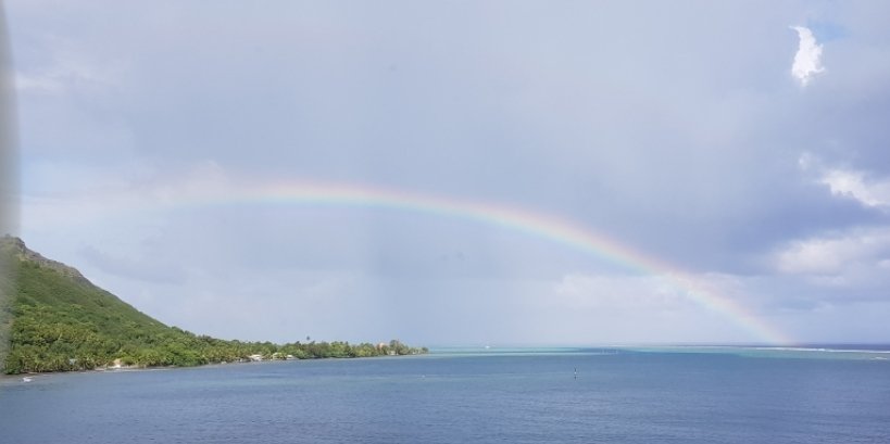 Rückkehr von der Jeep Safari mit dem schönen Namen „Bilder von Moorea“. Mit zwei Fahrzeugen und 14 Mitreisenden, den 2 Fahrern und einem Guide von der AIDAcara gelingen uns traumhafte Fotos von einer traumhaften Insel. Bereits beim Übersetzen mit dem Tender-Boot verwöhnt uns ein Regenbogen.