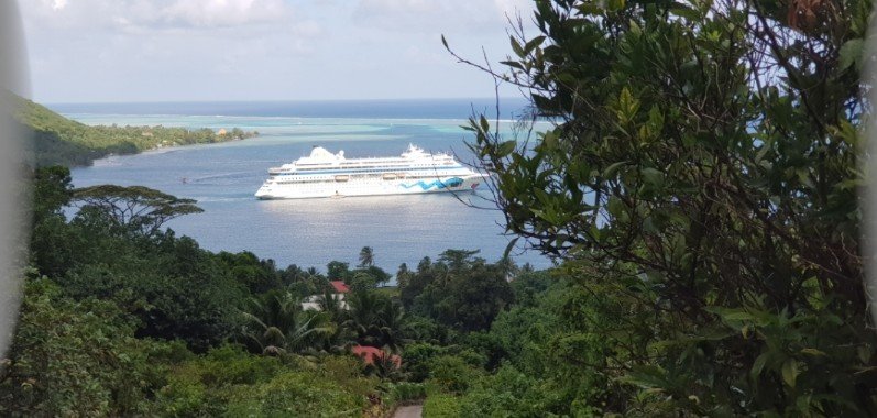 Weiter oben ein Blick auf die AIDAcara. Die westlich gelegene Opunohu-Bucht diente übrigens dem Spielfilm „Die Bounty“ 1984 als Kulisse für Dreharbeiten. Daraufhin sollte man sich den Film direkt noch einmal anschauen.