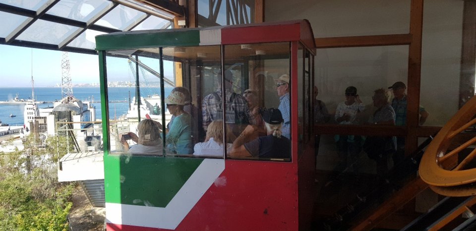 Anschließend fahren wir – ein „Muss“ in diesem Stadtviertel – mit der historischen Standseilbahn ins Herz von Valparaíso, von der Ober- in die Unterstadt zum Plaza Sotomayor.