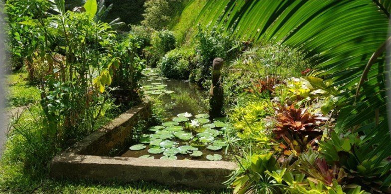 Daneben ein kleiner Bach mit Seerosen und wunderschönen Blumen rundherum. Ein kleiner Maoi aus Holz rundet das Bild ab. Es ist eine verzauberter Garten, der hier eine erstaunliche Ruhe ausstrahlt.