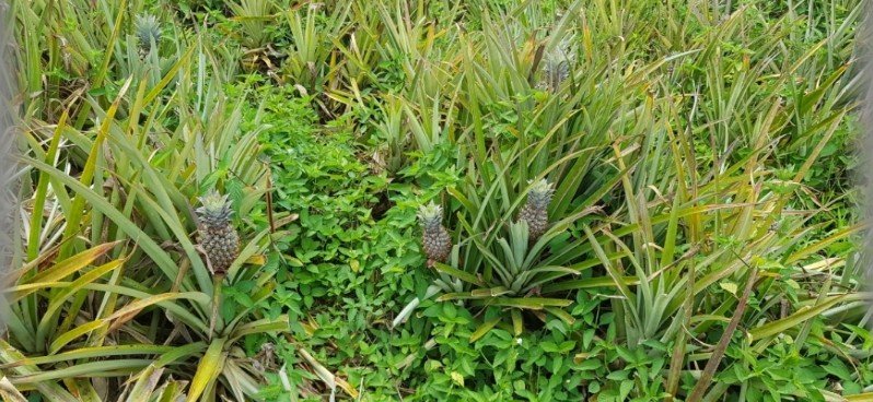 Schon einmal den Anbau von Ananas im Feld gesehen? Zunächst sehr unscheinbar, dann aber deutlich zu erkennen. Die Pflanzen sehen allerdings etwas verwildert aus. Viel Unkraut um sie herum beeinträchtigen möglicherweise auch ihr Wachstum.