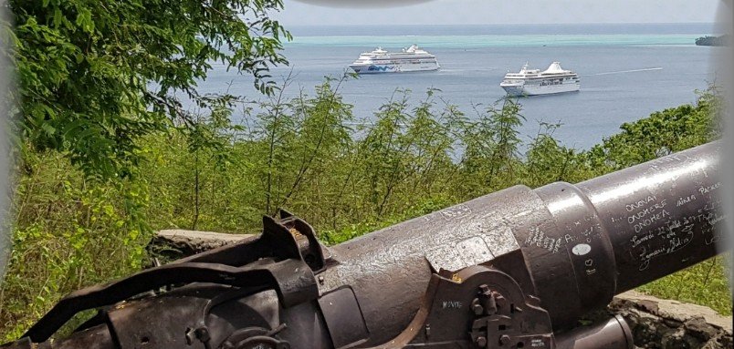 Alte amerikanische Kanone, Kreuzfahrtschiffe im Hintergrund.