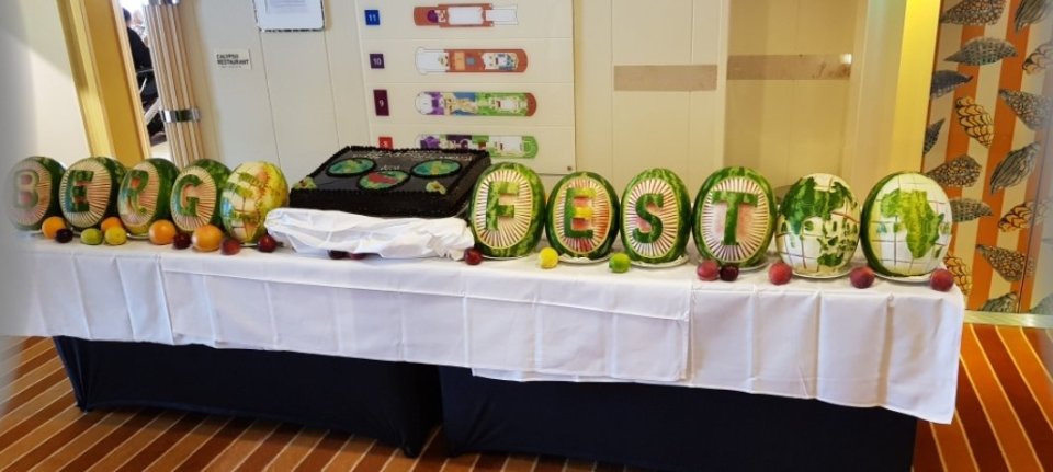 Am Abend fand, wetterbedingt (zu stürmisch), die Bergfest-Party nicht auf dem Pooldeck, sondern im Theater statt. Neben dem Sektempfang wurde u.a. die eigens gebackene Riesentorte mit der Aufschrift „Bergfest“ konsumiert.