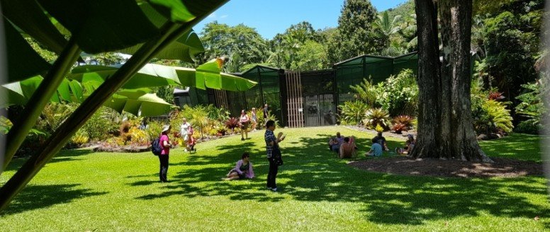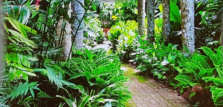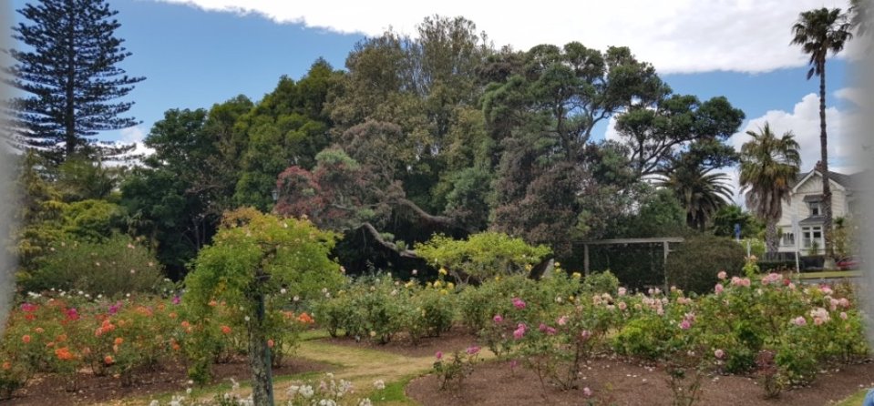 Vorbei an dem berühmten Rosengarten mit den über 500 Rosenarten. Im Hintergrund ein fantastisches Baumwunder.