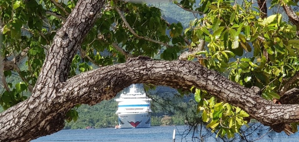 - AIDAcara liegt auf Reede, Loh Liang Wooden Jetty