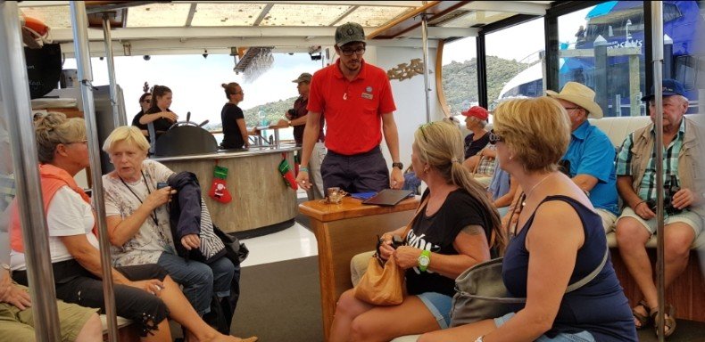 Zurück vom Ausflug, welcher mit einer leichten Verspätung begann. Nach dem Übersetzen mit dem Tender- gingen wir direkt auf unser Ausflugsboot und wurden von der Besatzung herzlichst empfangen.