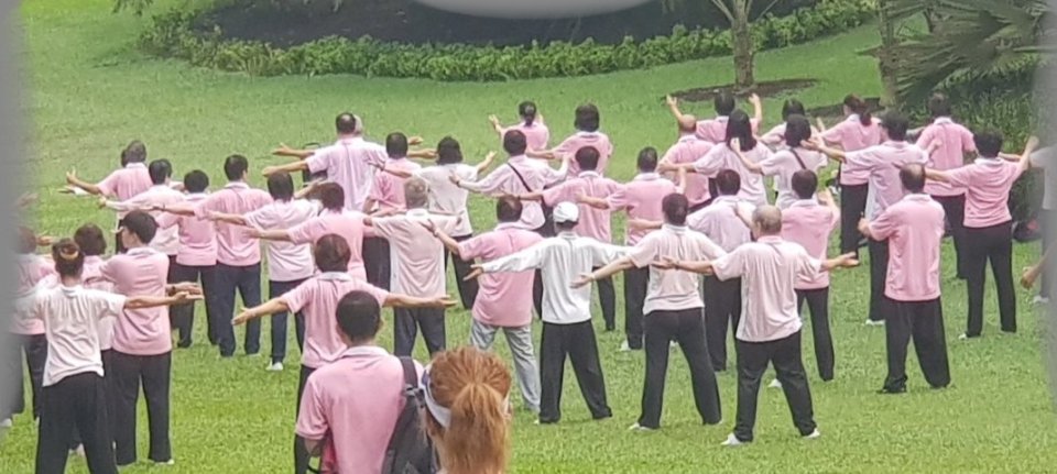 Überraschung im öffentlichen Bereich des Gartens. Dutzende Einwohner bei der Morgengymnastik.