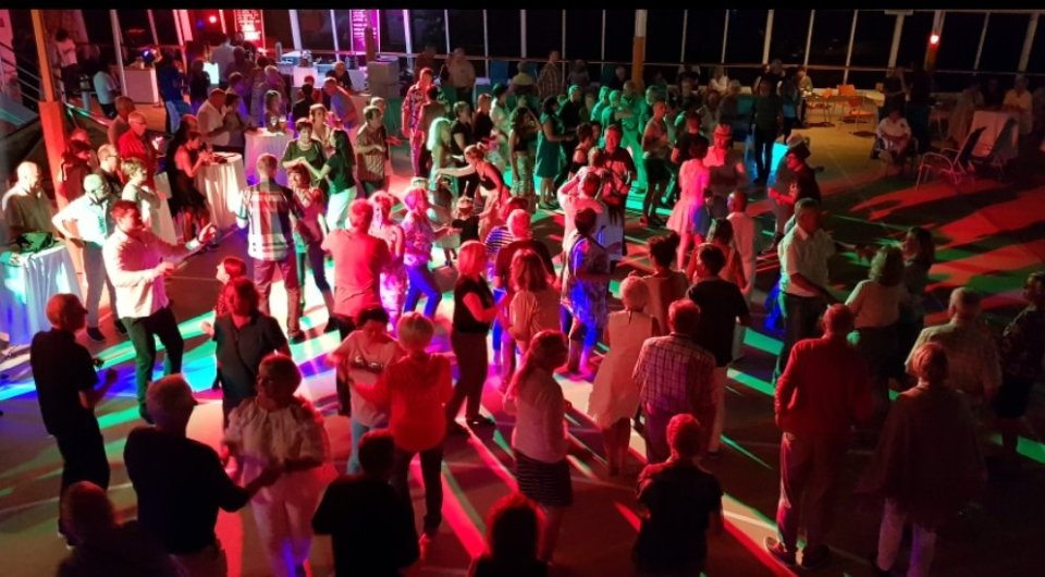 Wir waren gestern Abend auf ein Stück karibisches Flair und eine bunte Mischung aus Gesang und Tanz auf dem Pooldeck gespannt. Zunächst stimmten uns Clara und Michi um 21:00 Uhr mit einem Merengue-Tanzkurs auf die folgende Poolparty ein.