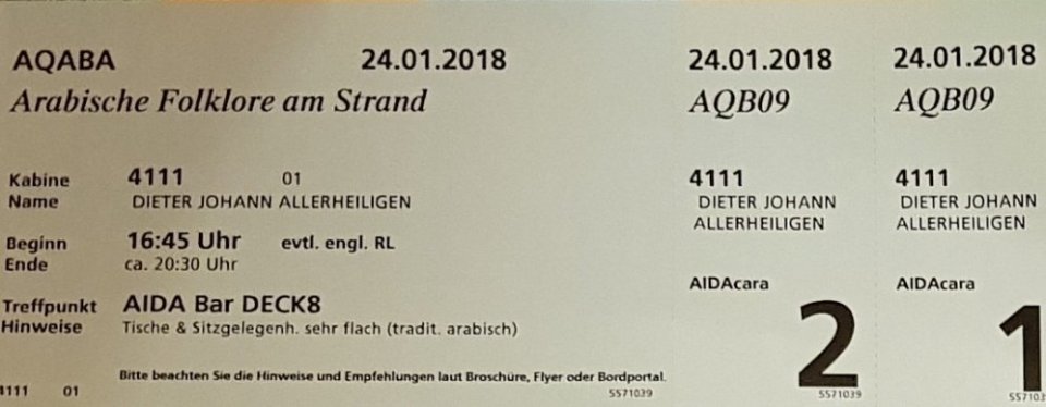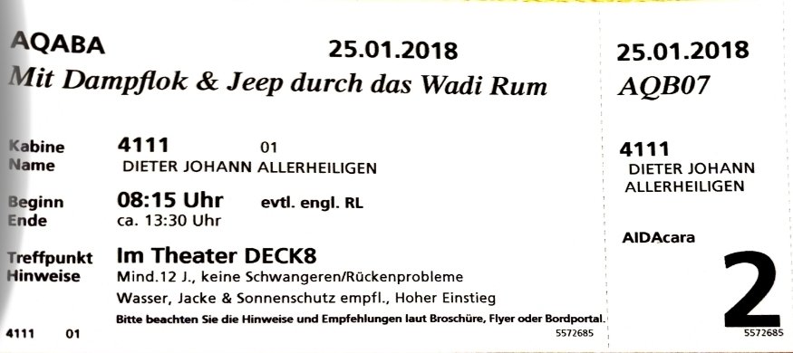 Bei einigen der bisherigen Ausflüge wurde, wie auch bei diesem, die folgende Warnung durch Aida ausgesprochen: „In Aqaba besteht eine latente Gefährdung durch Anschläge mit terroristischem Hintergrund.“