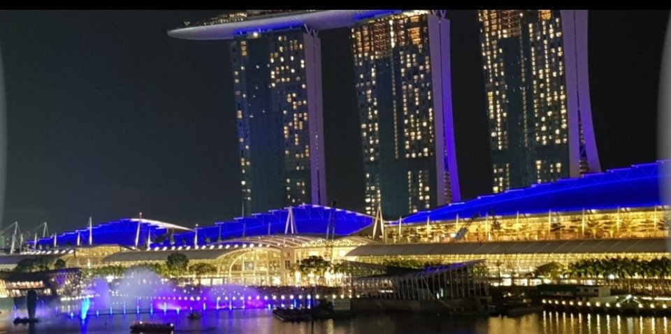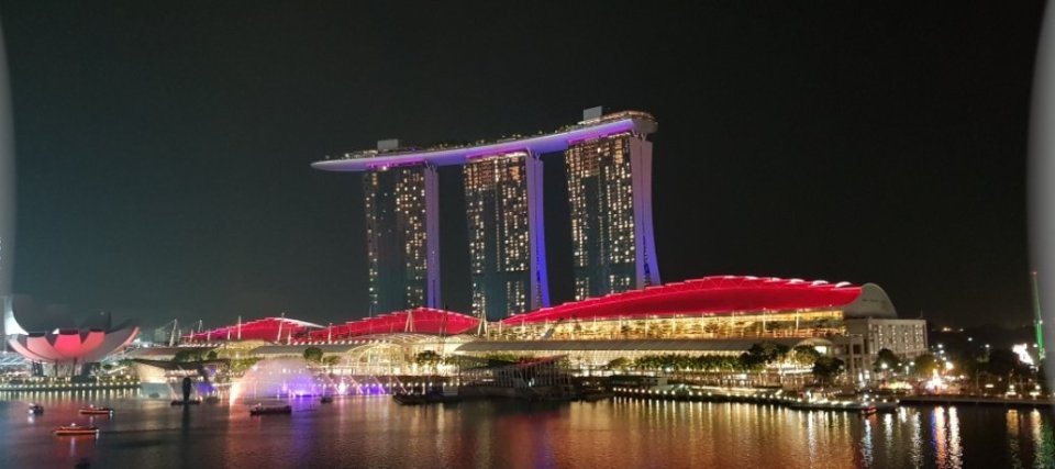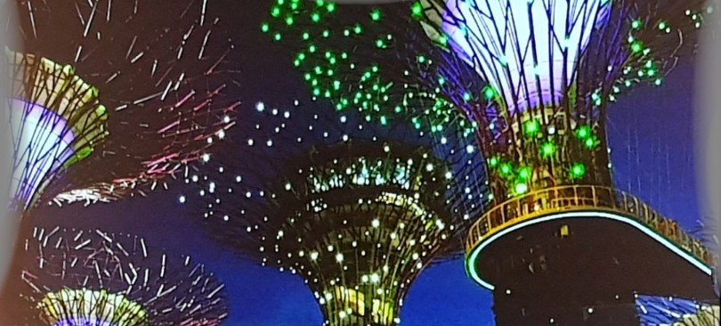 Denn genau von gegenüber hören und sehen wir vom „Hotel Marina Bay Sands“ mit jeder nur denkbaren Großmedia-Unterstützung, wie die Nacht zum Tage wird.