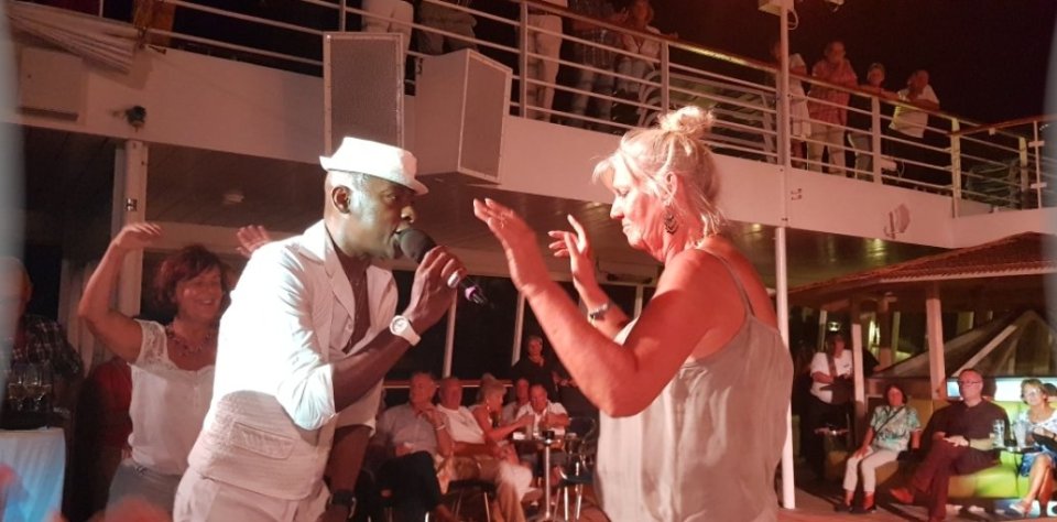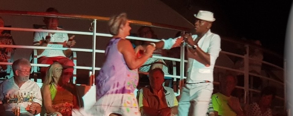 Wir waren gestern Abend auf ein Stück karibisches Flair und eine bunte Mischung aus Gesang und Tanz auf dem Pooldeck gespannt. Zunächst stimmten uns Clara und Michi um 21:00 Uhr mit einem Merengue-Tanzkurs auf die folgende Poolparty ein.