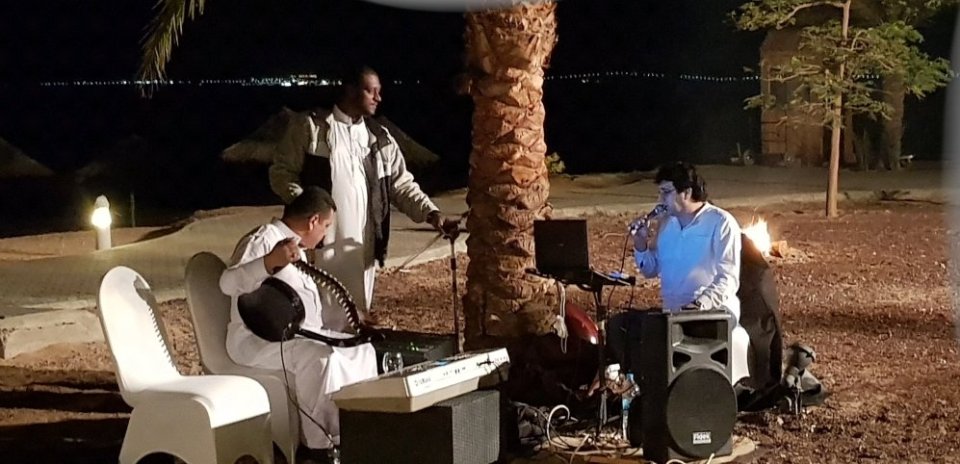 Nach einer kurzen Busfahrt in den Süden Aqabas an einen Privatstrand empfängt uns eine traditionelle Folklore-Band mit typisch arabischer Musik, passend zum Ambiente dieses sehr stimmungsvollen Ortes.